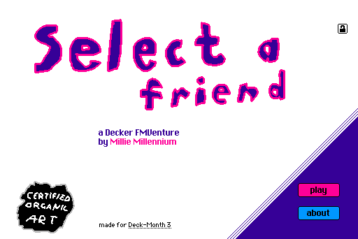 This is a short experimental Decker work, made for the Deck-Month 3 jam, to see if one can make an interactive FMV-based adventure in Decker. It's a short one-choice game where you can pick one of two plushies to befriend. The "about" screen explains some of the techniques I used to get video into Decker and make it playable.